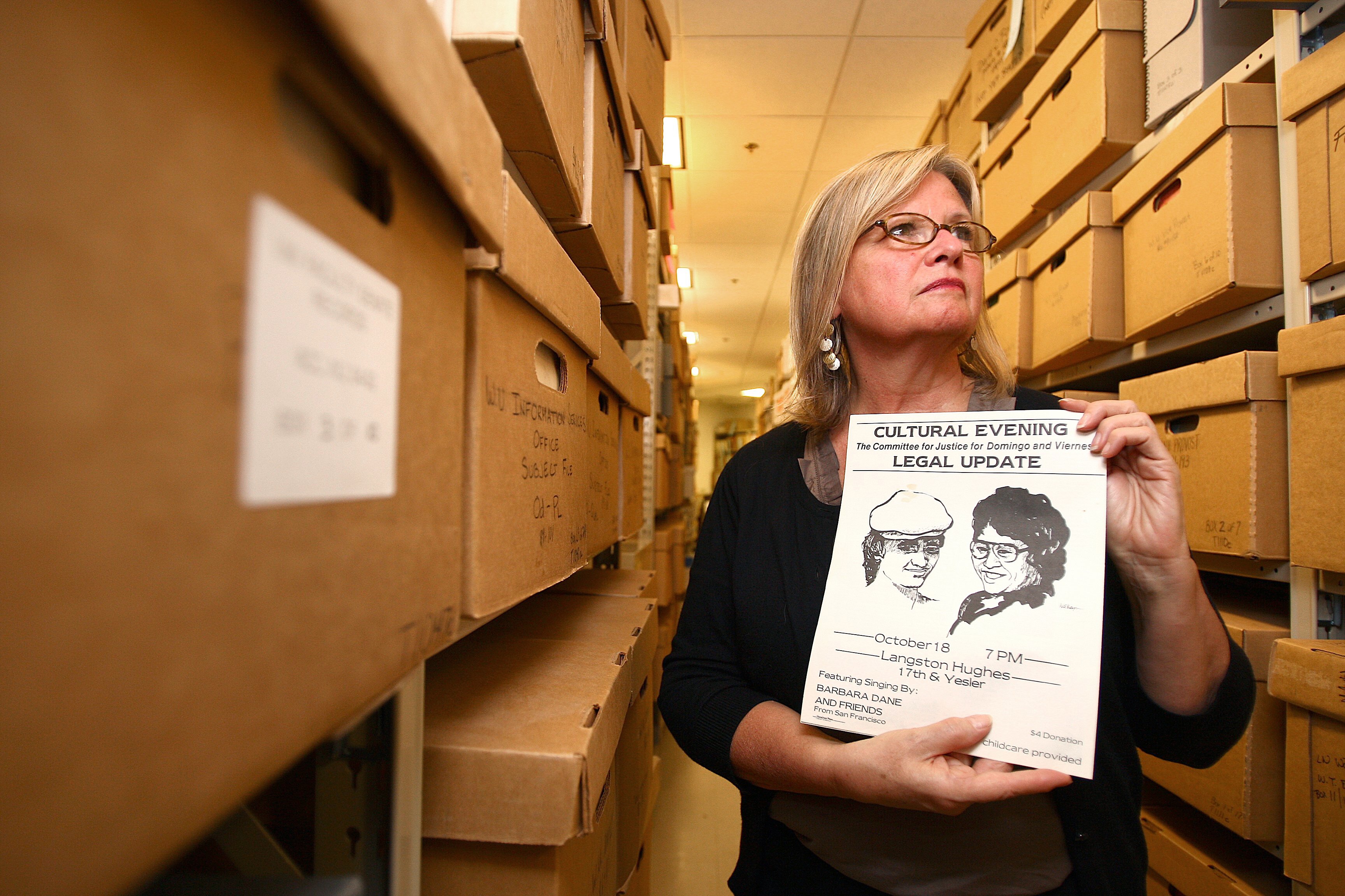 IBU Secretary-Treasurer Terri Mast holds a meeting flier from the early 1980s about the murder of her husband, Silme Domingo, and fellow activist Gene Viernes. The documents are a part of the UW Labor Archives which will celebrate a 20th Anniversary with the Harry Bridges Center next year.